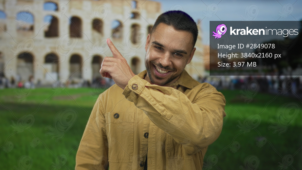 Man lifts finger pointing to ancient roman colosseum building with detailed facade under bright midday sky; wonder.