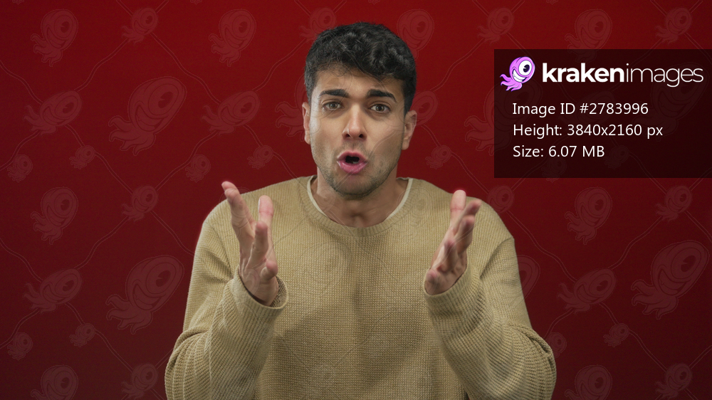 Man lifts hands while gesturing in studio portrait of young hispanic male against background red with concerned expression.