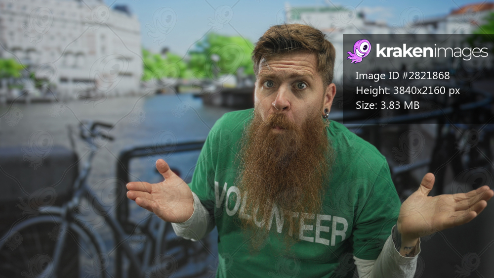 Man with long beard beckons with finger near face on canal street alongside bicycle rack; curiosity.