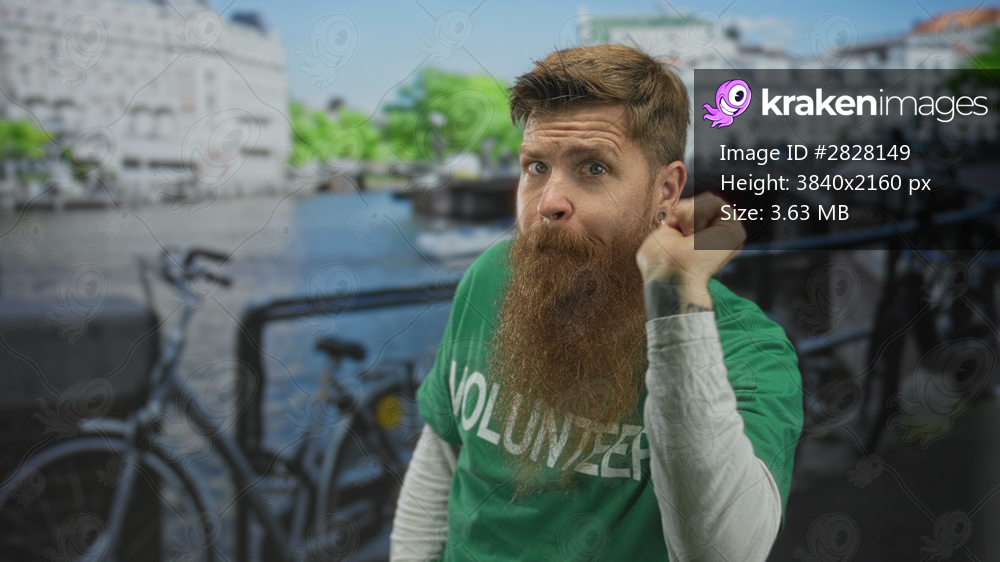 Man with long beard beckons with finger near face on canal street alongside bicycle rack; curiosity.