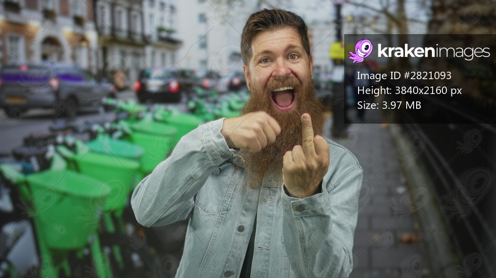 Man with long beard flips middle finger at row of green rental bikes parked on busy city street; defiance.