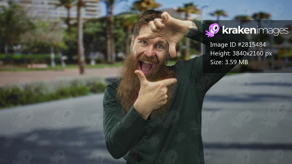 Man with long beard frames a scene with fingers while smiling on a city street in bright daylight; excitement creativity.