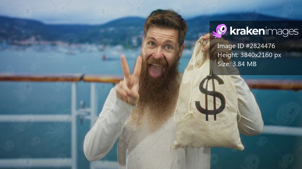 Man with long beard holds canvas money bag and makes victory sign on boat deck against coastal hills view; victory.