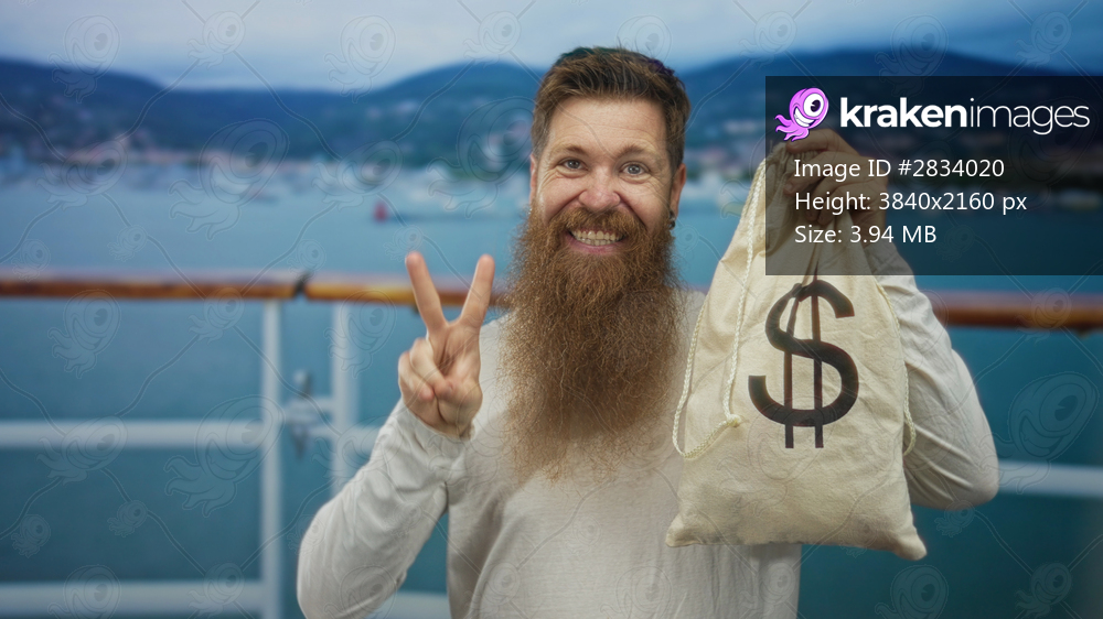 Man with long beard holds canvas money bag and makes victory sign on boat deck against coastal hills view; victory.