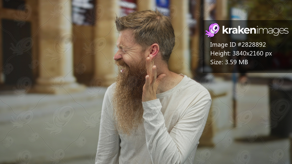 Man with long beard holds hand to ear on street, scrunches face and tilts head in pain with earache; discomfort.