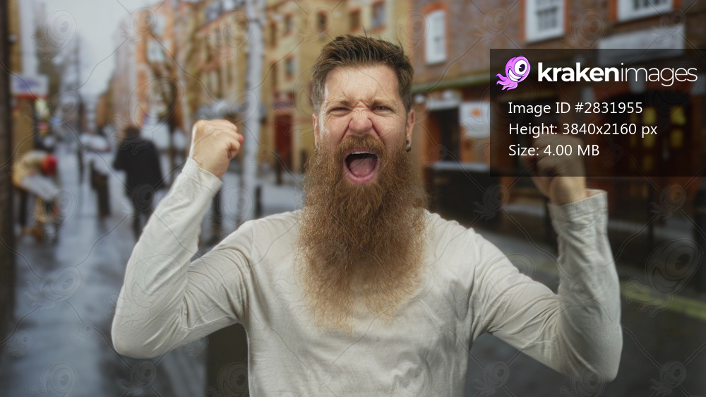 Man with long beard in white shirt flexes arms on rainy downtown street; pure triumphant big moment.