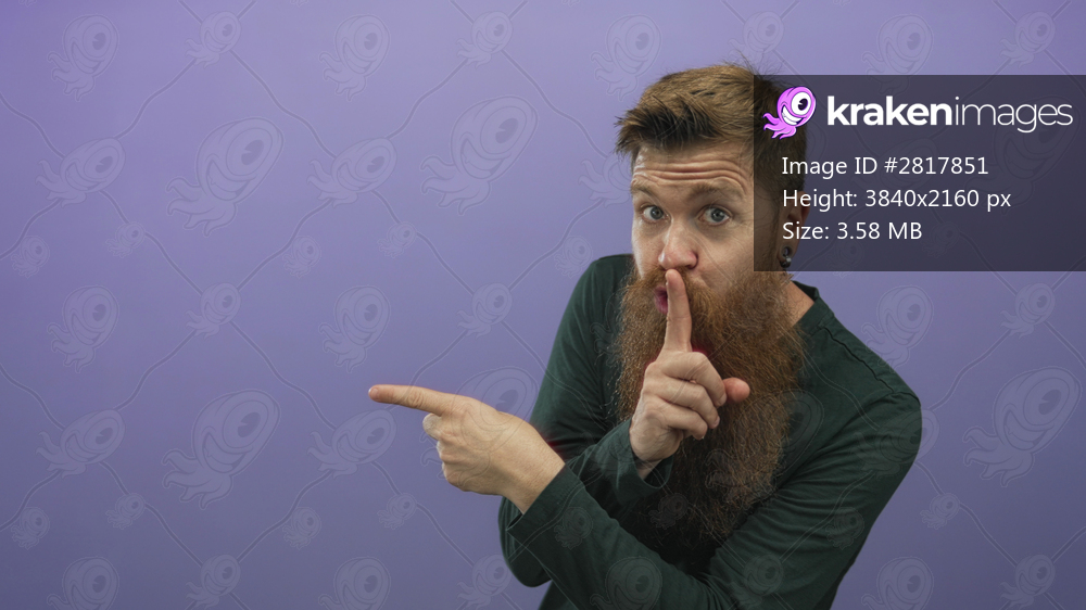 Man with long beard pointing finger to side and finger to lips for silence in purple studio; silence.