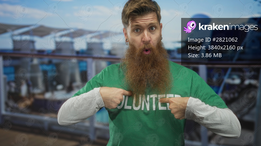 Man with long beard points finger to volunteer shirt on cruise deck while opening mouth in surprise; service community support pride.