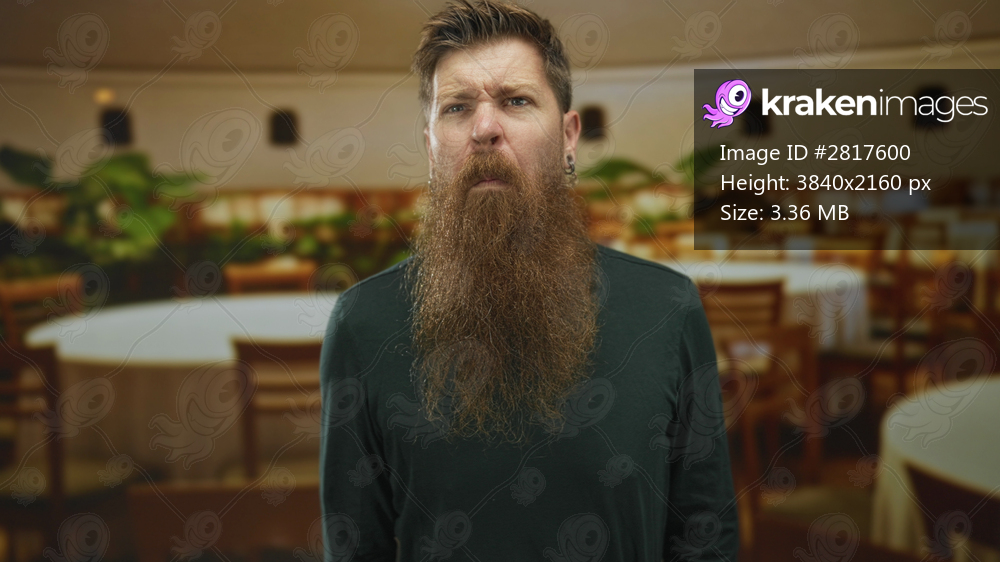 Man with long beard scrunches nose in dimly lit restaurant filled with round tables and chairs; disgust.