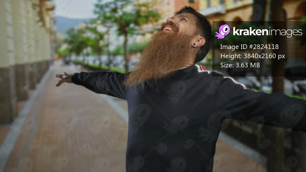 Man with long beard spreads arms and tilts head back on a city street under soft morning sunlight; freedom.