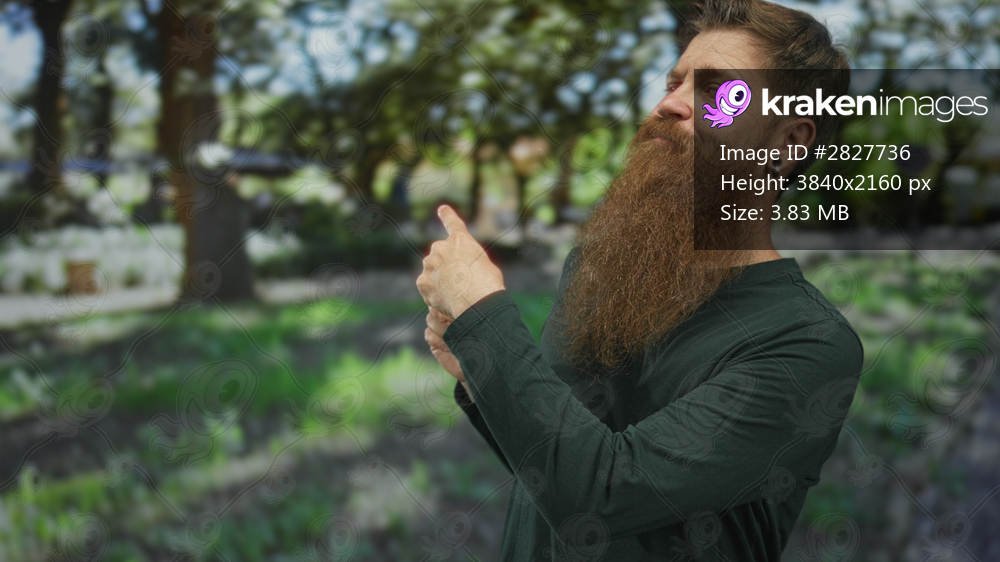 Man with long beard standing finger pointing toward sunlit green forest path; exploration curiosity.