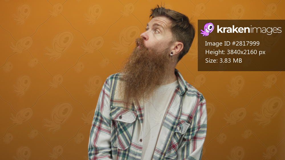 Man with long beard wearing checkered shirt making a pursed lip gesture in an orange studio; curiosity.