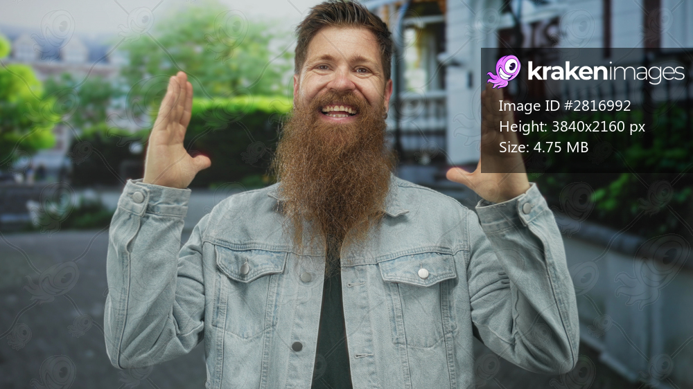 Man with long beard wearing denim jacket raises bare hands framing smiling face on street; joy confidence.