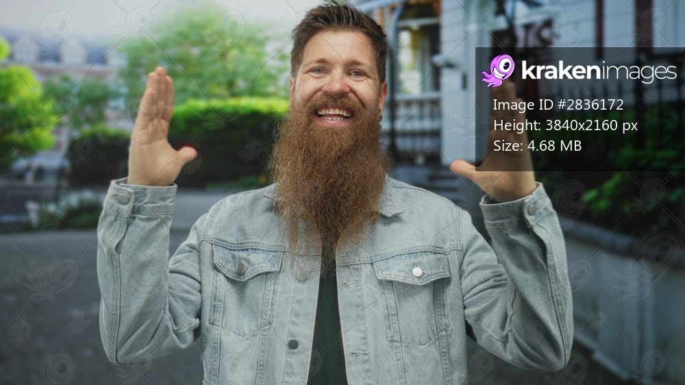 Man with long beard wearing denim jacket raises bare hands framing smiling face on street; joy confidence.