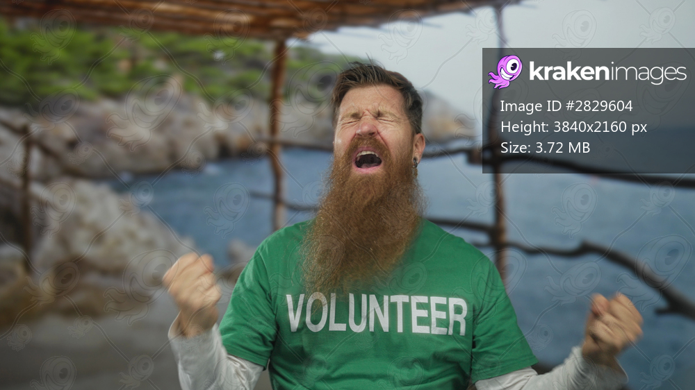 Man with long beard wearing green volunteer shirt raises clenched fist at rocky beach under wooden pergola; triumph.
