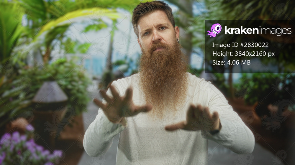 Man with long beard wearing white shirt raises both hands palm forward in forest path surrounded by lush green foliage; calm caution.