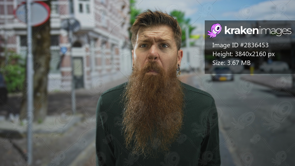 Man with long beard widens eyes on street; curiosity introspection reflection.