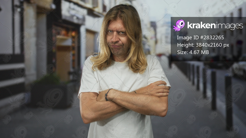 Man with long blond hair crossing arms and stern expression on crowded city street lined with cars and buildings; defiance.