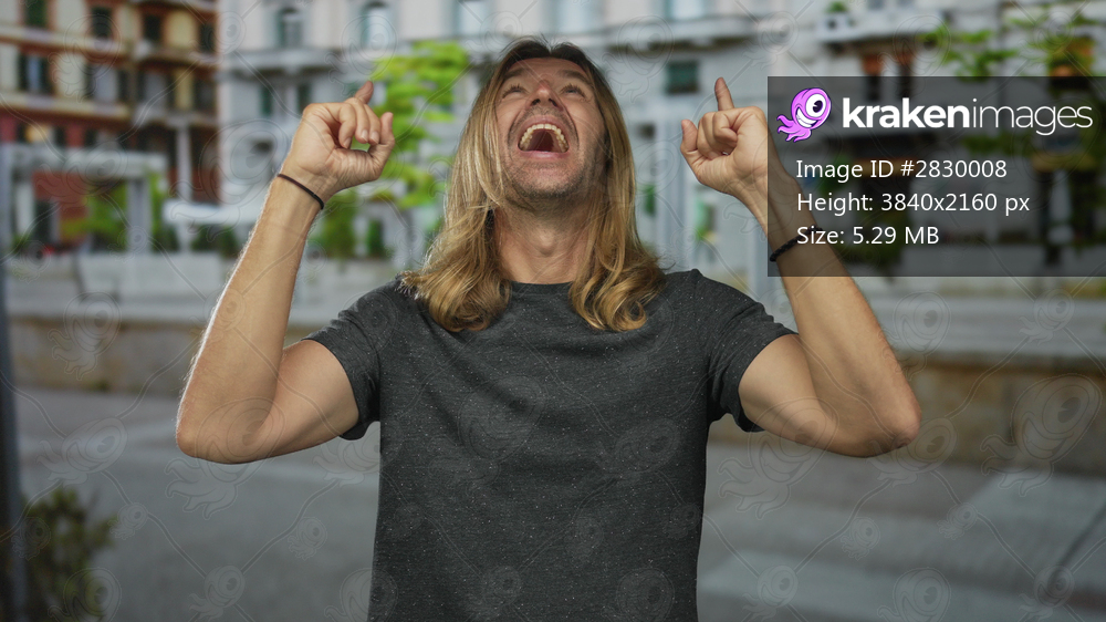 Man with long blond hair pointing both index fingers upward on urban street while smiling broadly in daylight; optimism.