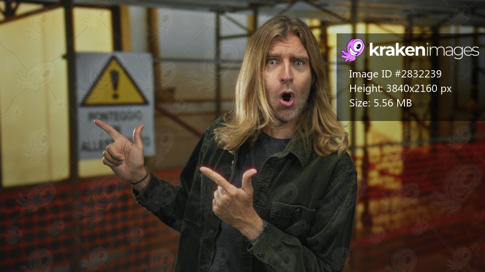 Man with long blond hair pointing finger to hazard sign on orange mesh scaffolding at construction site; surprise.