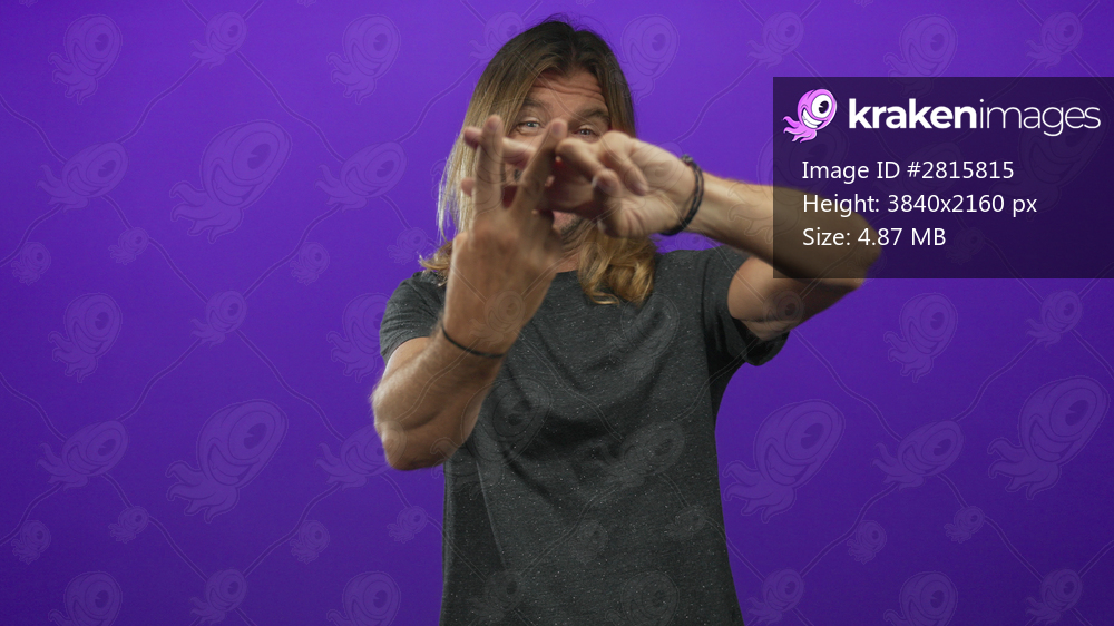 Man with long blond hair smiling and making hashtag gesture with fingers in purple studio; playful fun.