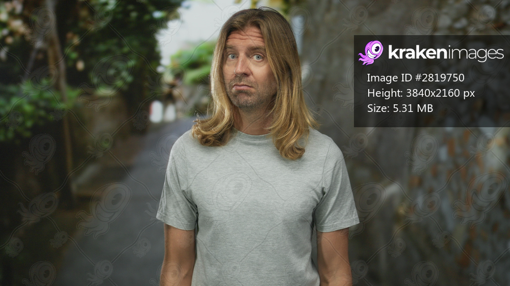 Man with long blond hair and stubble wearing a gray tshirt raises eyebrows on urban street next to stone wall; uncertainty.