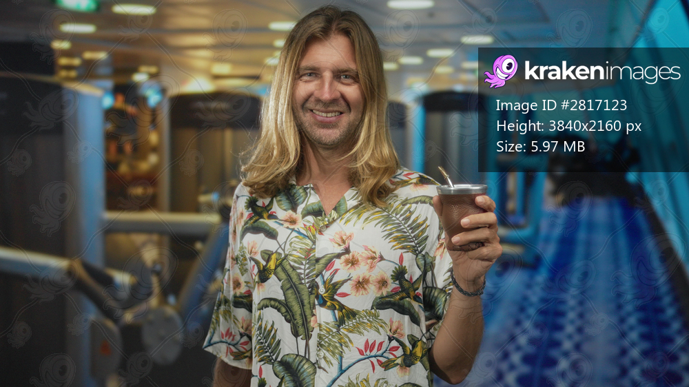 Man with long blond hair wearing a floral shirt smiling while holding cup in a bright studio filled with gym equipment; contentment.