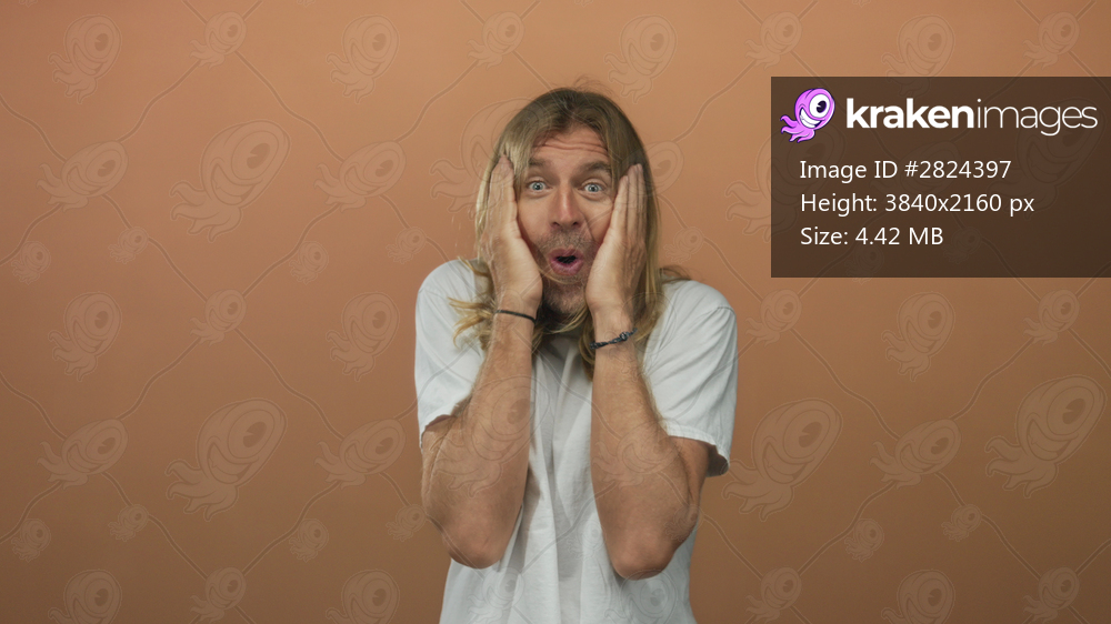 Man with long blond hair wearing a white t shirt points finger to chest in a peach studio setting while staring forward with widened eyes; surprise.