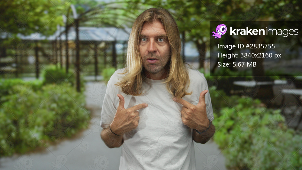 Man with long blond hair and white shirt points both thumbs to chest on narrow forest path lined with green shrubs and empty benches; self doubt.