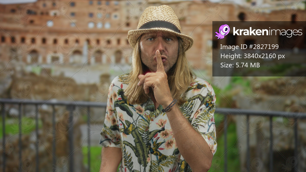 Man with long blonde hair and straw hat holds finger to lips amid ruins inside an ancient colosseum building; silence.