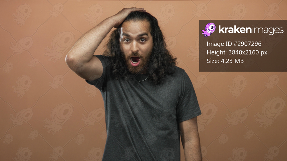 Man with long curly hair and beard, hand on head and open mouth in studio against peach wall wearing dark grey t shirt; surprise wonder.