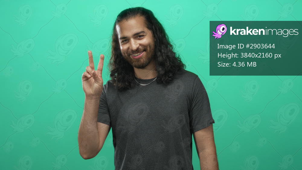 Man with long curly hair and beard showing peace sign with right hand in green studio setting, wearing dark t shirt; friendly greeting and optimism.