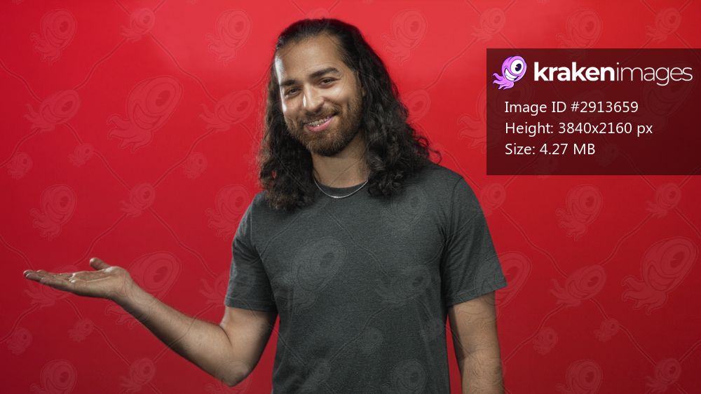 Man with long curly hair and necklace shows open palm and smiles in red studio setting; friendly approachable.
