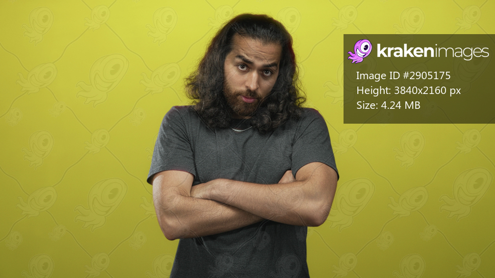 Man with long dark hair and beard, arms crossed and raised eyebrows in studio against yellow wall; skepticism.