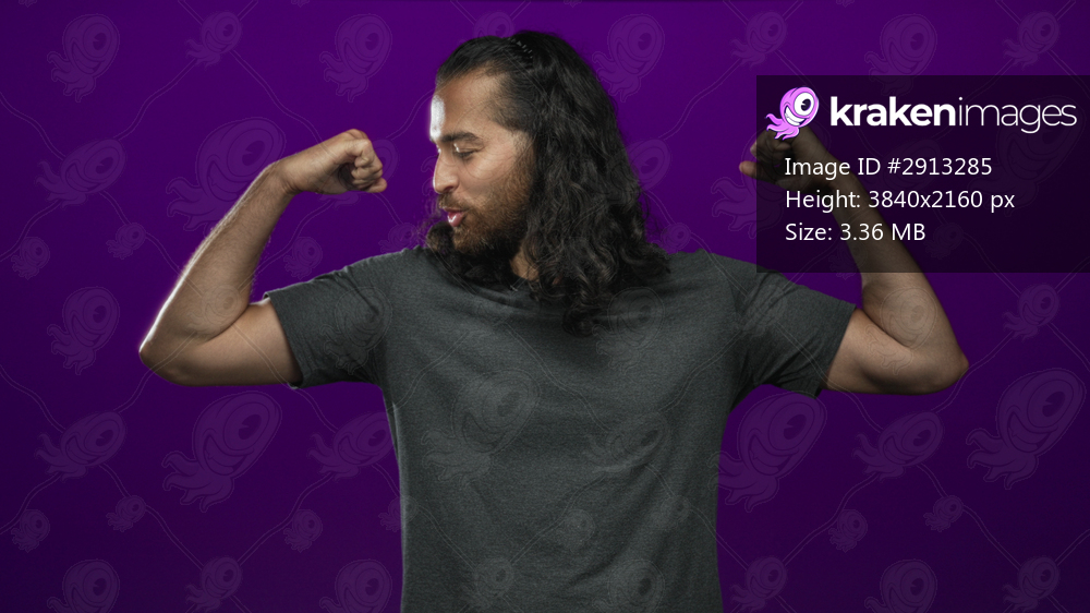 Man with long dark hair and beard flexing biceps and smiling in studio against purple backdrop; confidence strength determination.
