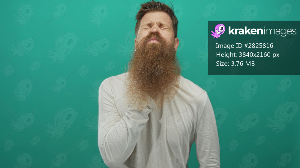 Man with long ginger beard in white shirt touches his throat against a green studio wall; discomfort.