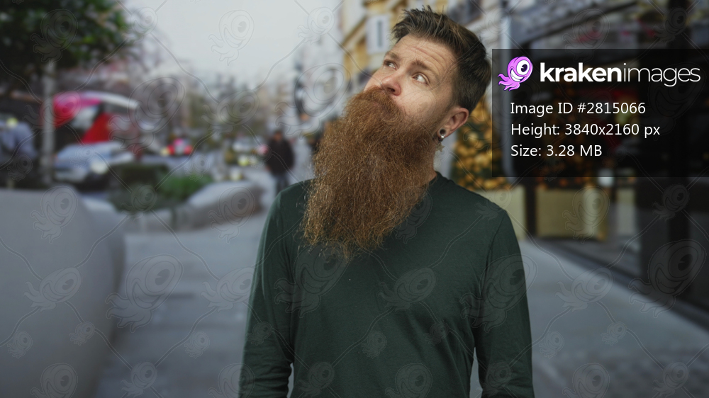 Man with long ginger beard looks up at sky on a busy city street with blurred background; curiosity.
