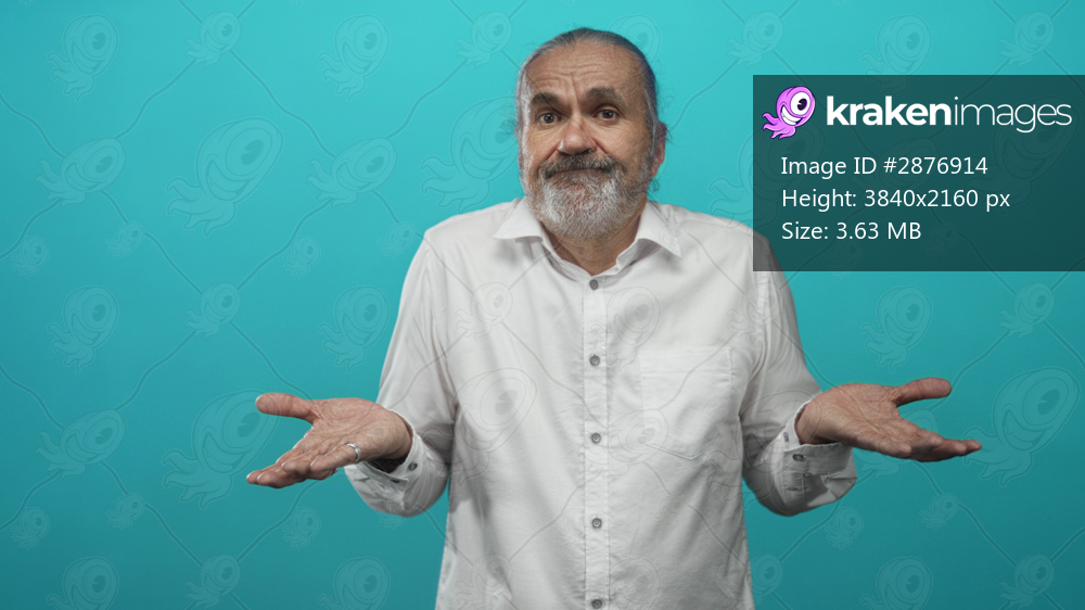 Man with long gray beard and long hair in white shirt shrugs with palms up in teal studio; uncertainty.
