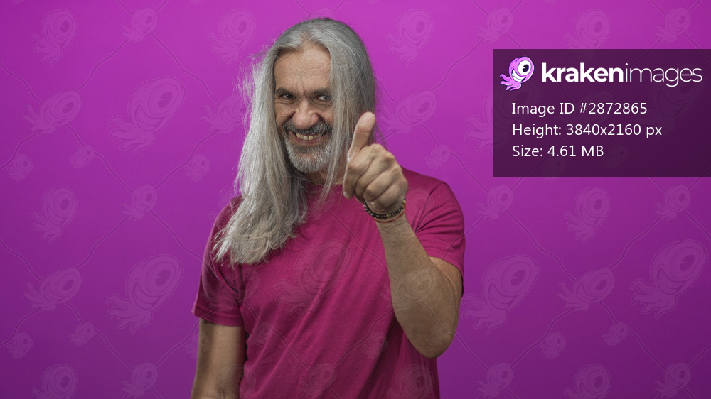 Man with long gray hair and beard pointing finger while wearing magenta tshirt in studio; playful confidence.