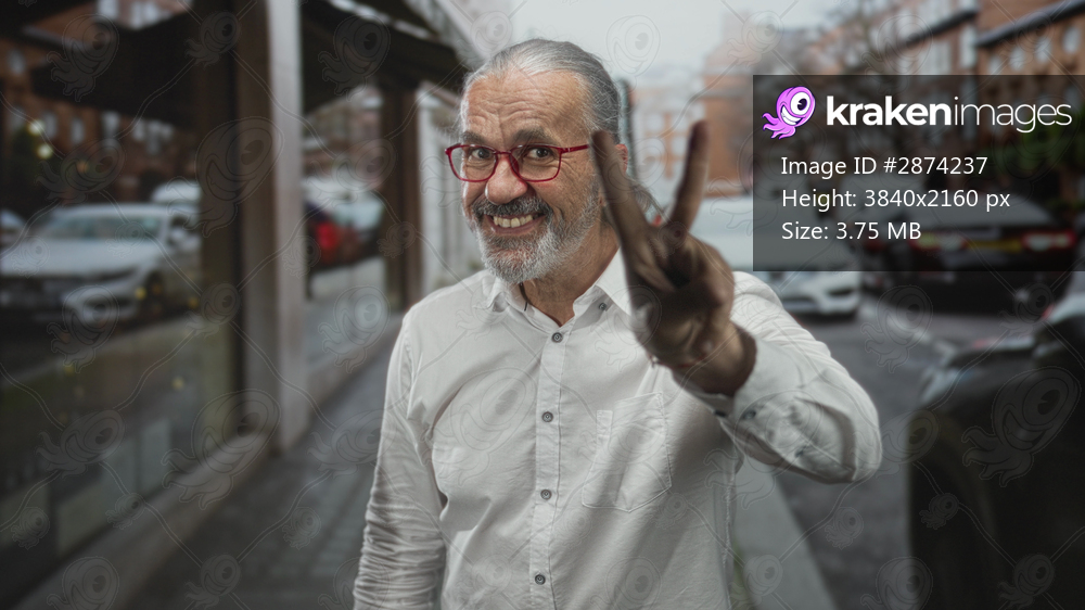 Man with long gray hair, beard and red glasses smiles and holds up two fingers for peace on a busy city street; joyful optimism.