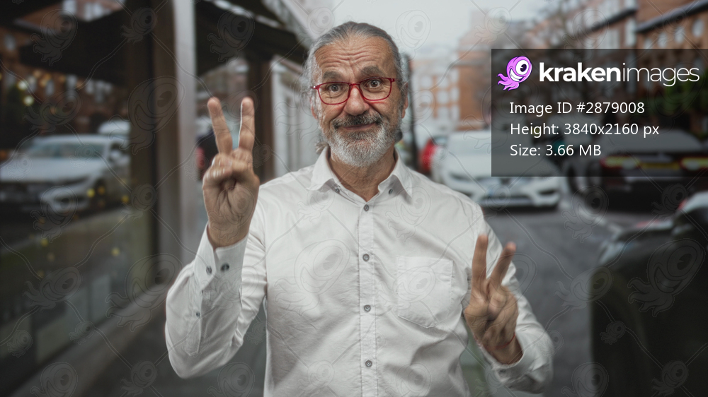 Man with long gray hair, beard and red glasses smiles and holds up two fingers for peace on a busy city street; joyful optimism.