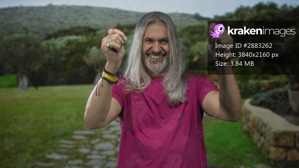 Man with long gray hair and beard shielding eyes with hand on forehead on a stone park path in a green countryside field while smiling and gesturing; joy leisure. - Kraken Images