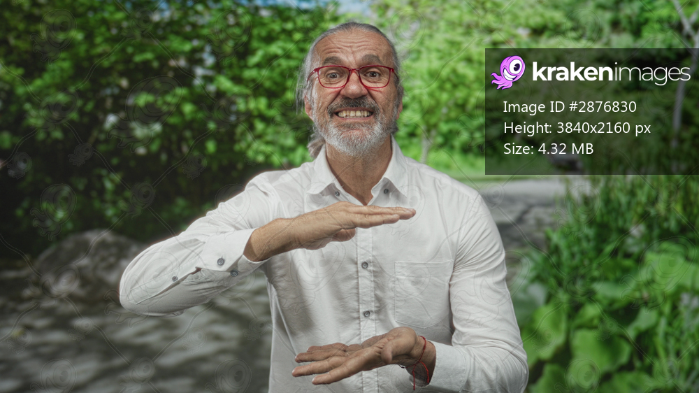 Man with long gray hair and beard, smiling and holding hands apart in a measuring gesture on a forest path wearing white shirt; serenity trust.
