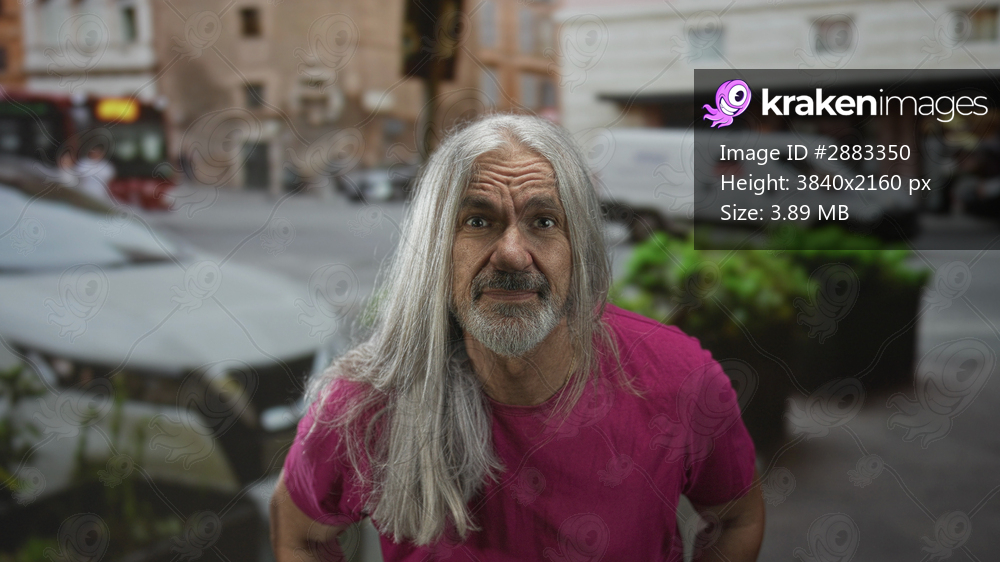 Man with long gray hair and beard squints and leans forward on city street near parked cars and planters; annoyance solitude.