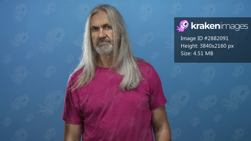 Man with long gray hair and beard standing in studio against blue backdrop, wearing magenta t shirt, neutral pose and direct gaze; melancholy reflection. - Kraken Images