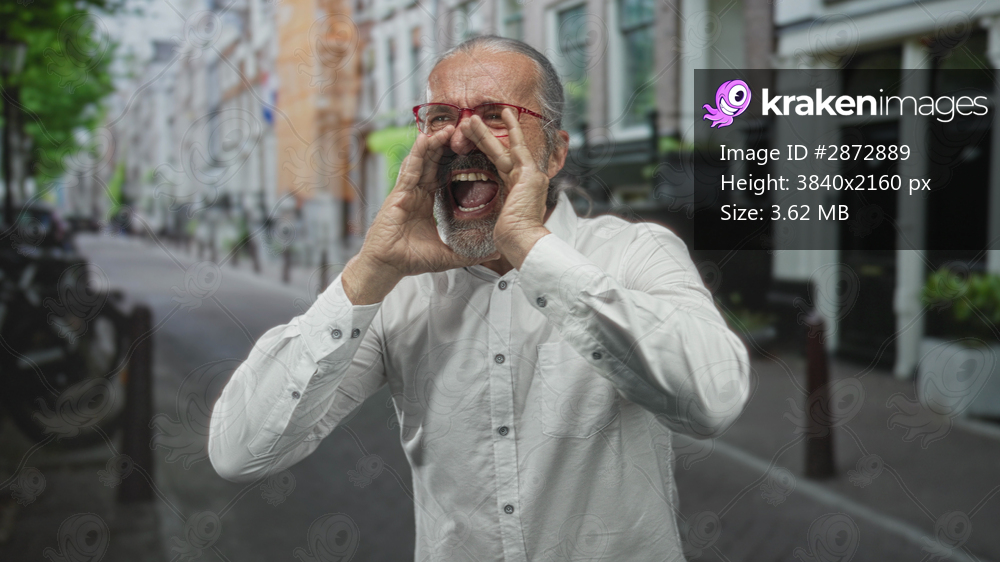 Man with long gray hair and beard, wearing red glasses and white shirt, shouting with hands cupped to mouth on narrow city street lined with buildings; protest anger. - Kraken Images
