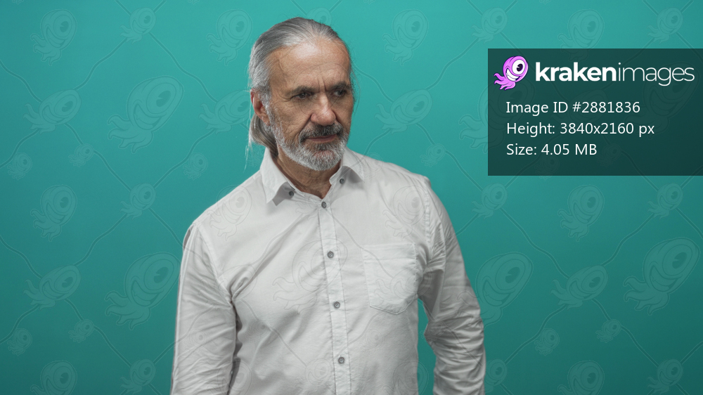 Man with long gray hair and beard wearing white shirt looking down in studio against teal background; pensive solitude.