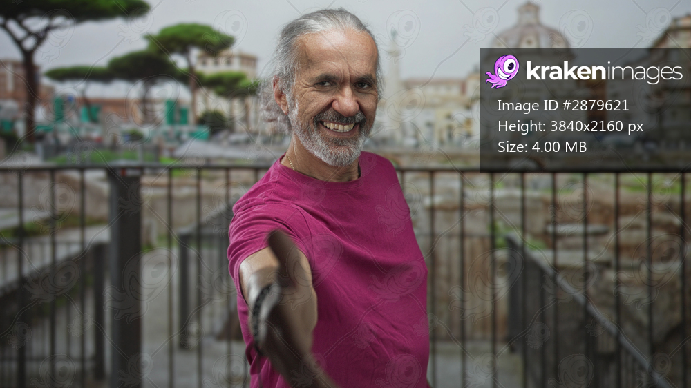 Man with long gray hair extends right hand toward camera at building ruins, smiling in magenta shirt; connection joy.