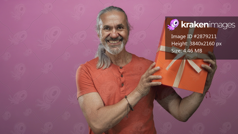 Man with long gray hair holding an orange gift box, smiling and presenting the wrapped present in a pink studio setting; celebration gratitude joy.