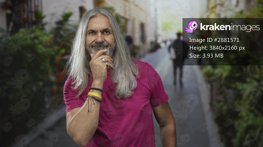 Man with long gray hair points finger at camera on a narrow street lined with plants and potted greenery; confidence invitation.